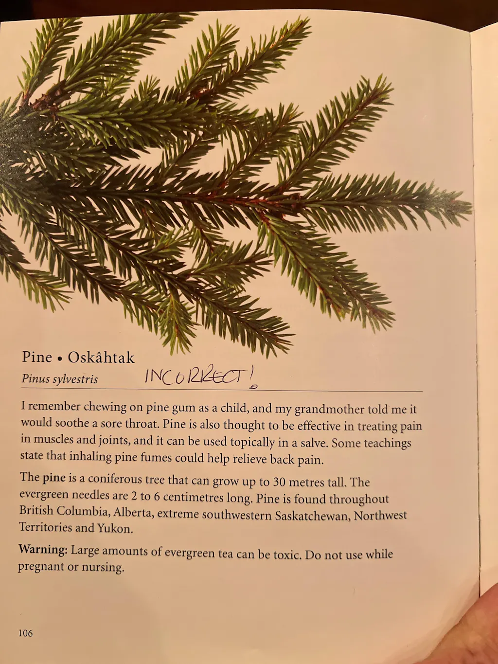 Love your book. Great info and tips. Straight forward and simple book great for referencing in my workshops. Photos are awesome. I do see an error though. The picture on page 106 above the description of a Pine tree is actually a spruce branch.